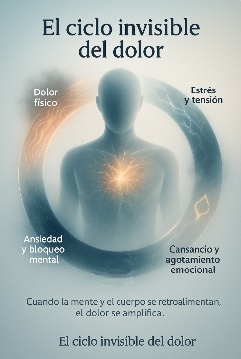 El dolor, el estrés, la ansiedad y el cansancio no actúan por separado: forman un círculo que se retroalimenta. Cuanto más estrés hay, más se tensa el cuerpo; cuanto más tenso está, más duele; y ese dolor constante, a su vez, genera más agotamiento emocional.