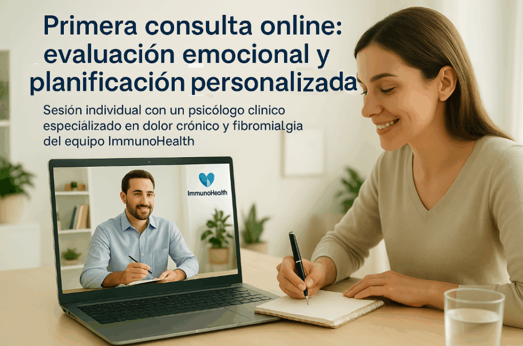 Todo comienza con una primera consulta online individual, dirigida por un psicólogo clínico especializado en dolor crónico y fibromialgia del equipo ImmunoHealth.